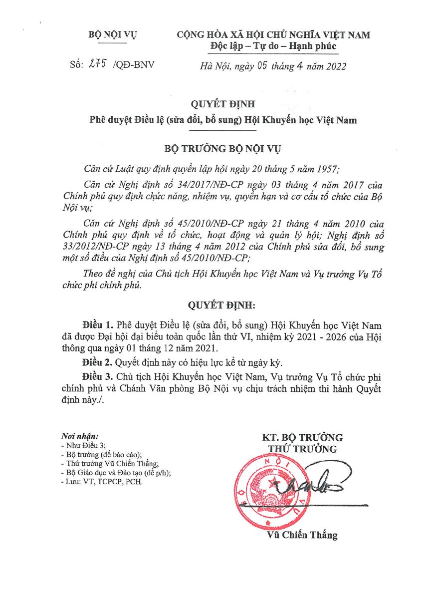 (Phê duyệt kèm theo Quyết định số 275/QĐ-BNV ngày 05 tháng 4 năm 2022 của Bộ trưởng Bộ Nội vụ)