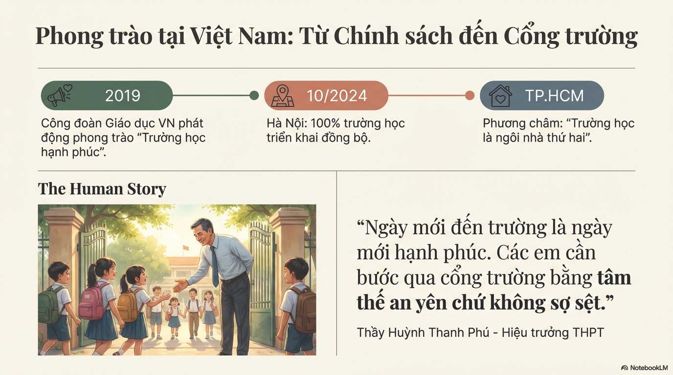 Khởi nguồn từ mô hình “Happy School” do UNESCO để xuất, năm 2019, Công đoàn Giáo dục Việt Nam đã phát động phong trào xây dựng “Trường học hạnh phúc”. Mục tiêu của cuộc vận động này là tạo ra môi trường học đường an toàn thân thiện, mỗi thành viên trong trường đều cảm nhận được sự tôn trọng và gắn kết với nhau, mỗi ngày tới trường là một ngày vui, không phải chịu áp lực lên tâm lý, tập trung vào sự học hành.