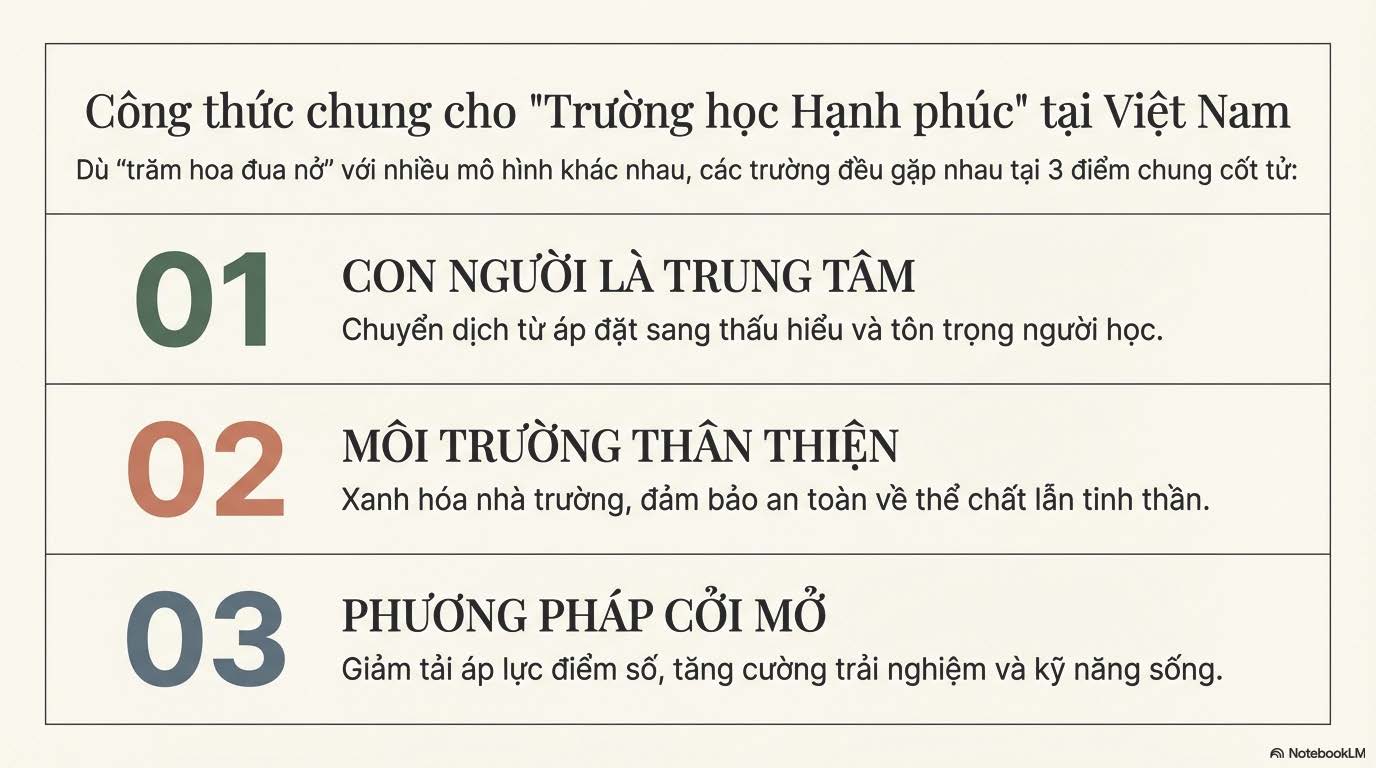 Phong trào xây dựng trường học hạnh phúc ở Việt Nam chưa trở thành một sự kiện lan tỏa khắp toàn quốc. Hiện chưa có một số liệu thống kê chính thức của nhà nước về số lượng trường hạnh phúc trong cả nước. Tuy nhiên, với mấy trăm trường đã hình thành và phát triển kiểu “trăm hoa đua nở”, mỗi trường có triết lý riêng, có ý tưởng riêng, có sáng kiến riêng, song, điểm chung nhất mà họ hướng tới là con người trong trường được tôn trọng, an toàn, phát triển thể chất, trí tuệ và tâm hồn.