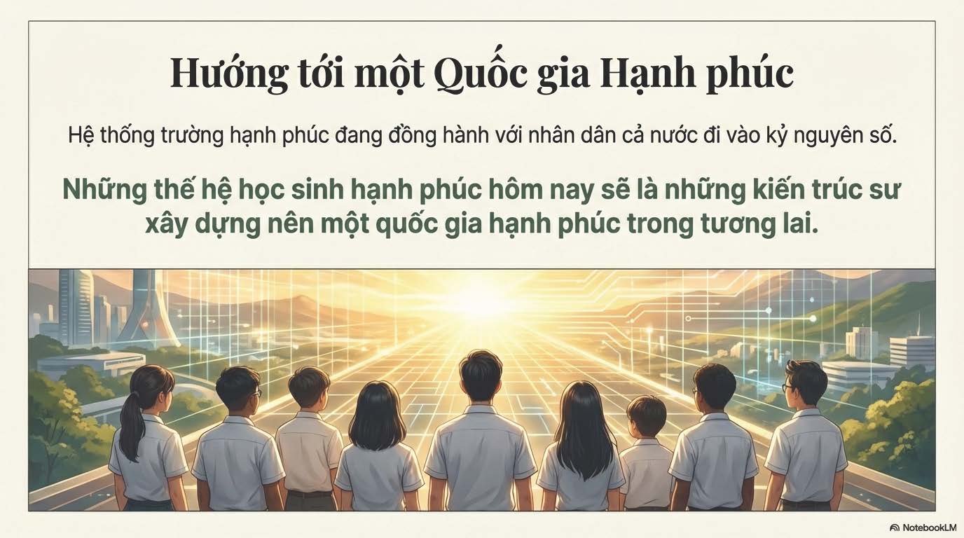 Nhà trường hạnh phúc đang tăng dần về số lượng và đang thể hiện sự đa dạng nhờ tư duy sáng tạo. Hệ thống trường hạnh phúc đang đồng hành với nhân dân cả nước đi vào kỷ nguyên số, hướng tới một quốc gia hạnh phúc. Ta có thể tin tưởng, chính các thế hệ học sinh hạnh phúc hôm nay sẽ là những con người tích cực xây dựng quốc gia hạnh phúc trong kỷ nguyên số.