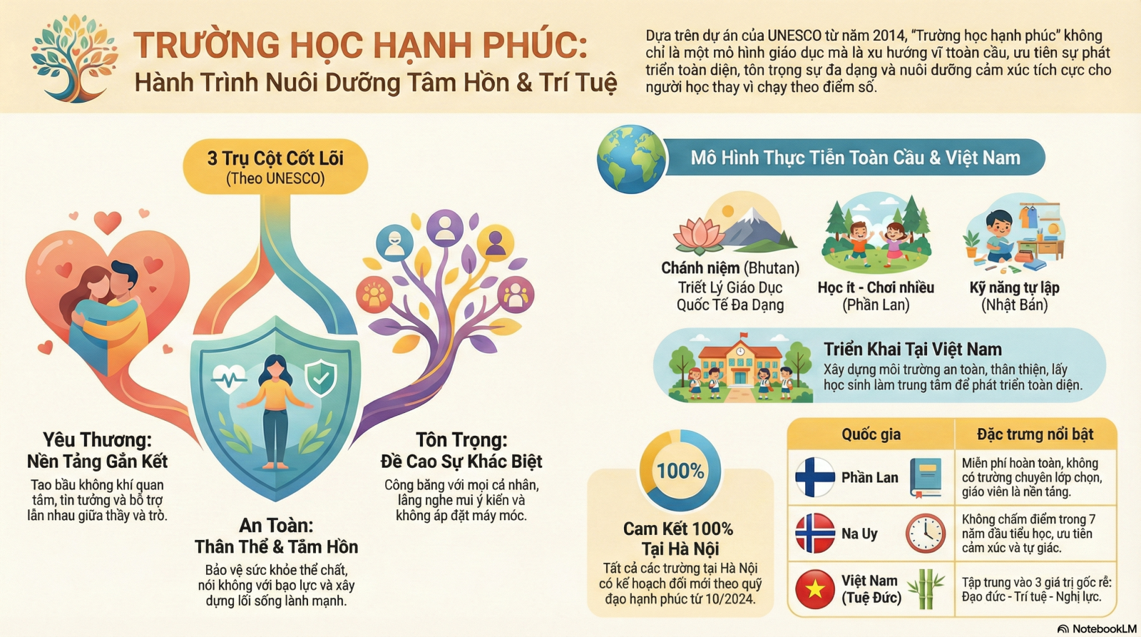 Trường học hạnh phúc, một xu hướng giáo dục toàn cầu do UNESCO khởi xướng với ba trụ cột chính là Yêu thương, An toàn và Tôn trọng. Cổng TTĐT Hội Khuyến học Việt Nam xin giới thiệu bài viết của GS.TS Phạm Tất Dong điểm qua cách tiếp cận đa dạng của nhiều quốc gia, nơi triết lý giáo dục chú trọng vào sự phát triển toàn diện, niềm vui và tinh thần tự lập hơn là áp lực điểm số. Dù mỗi nơi có cách làm riêng, mục tiêu chung vẫn là xây dựng một môi trường học đường nhân văn, giúp học sinh phát triển cả thân, tâm và trí.