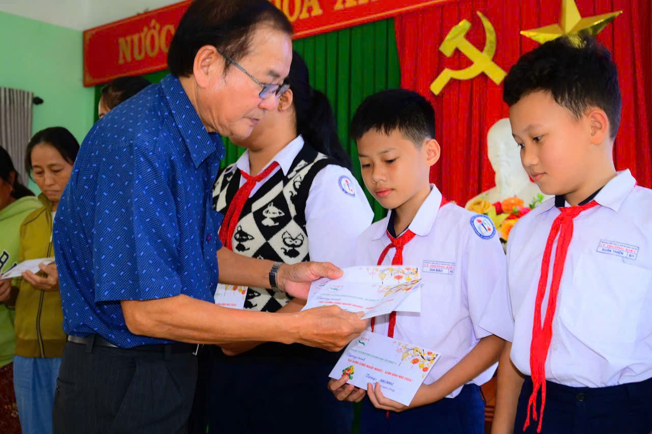 Ông Nguyễn Thuỳ, Chủ tịch Hội Khuyến học phường Hội An trao quà cho học sinh có hoàn cảnh khó khăn