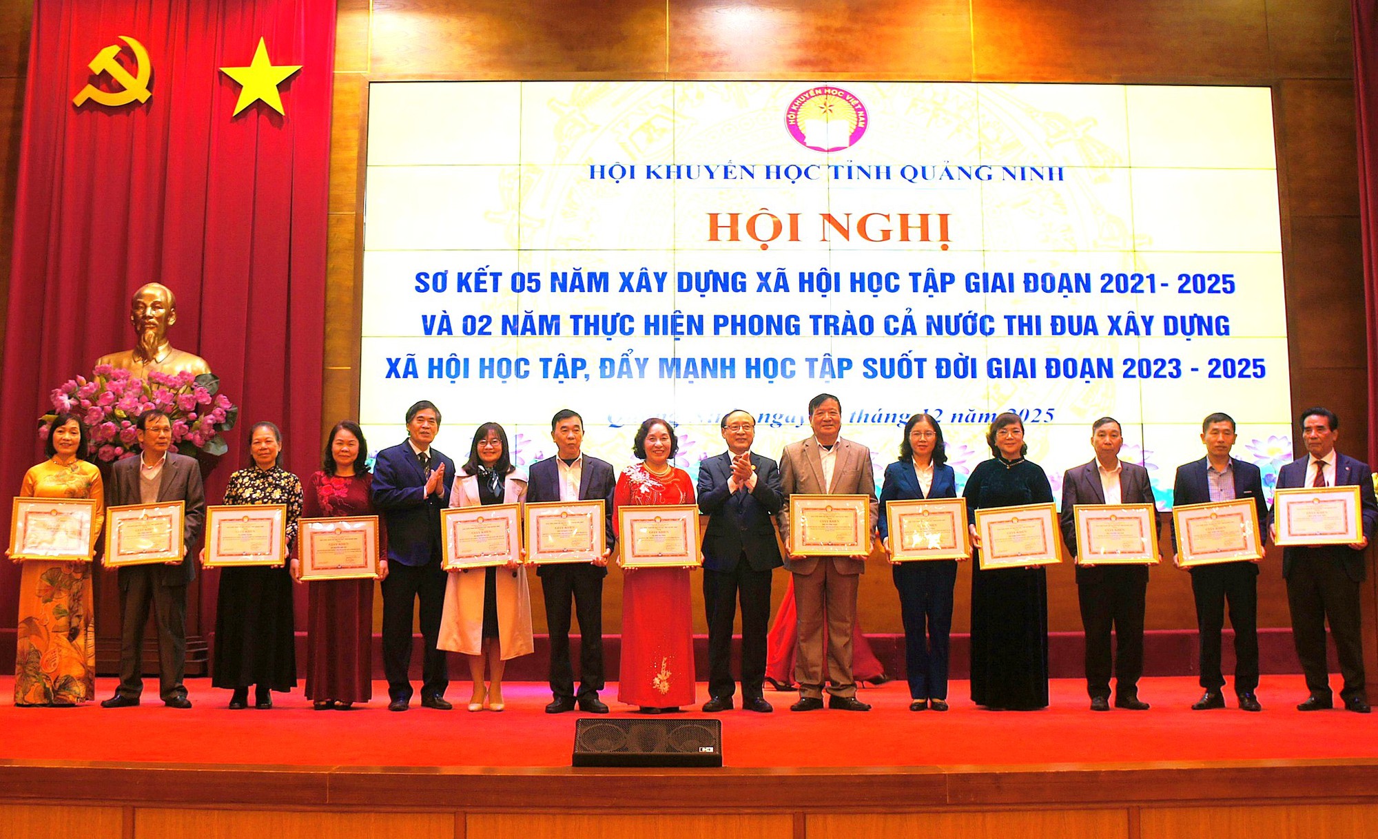 Hội Khuyến học tỉnh Quảng Ninh trao giấy khen cho 9 đơn vị học tập vì “Đã có thành tích xuất sắc trong phong trào thi đua khuyến học, khuyến tài, xây dựng xã hội học tập giai đoạn 2021-2025”. Ảnh: Hội Khuyến học Quảng Ninh