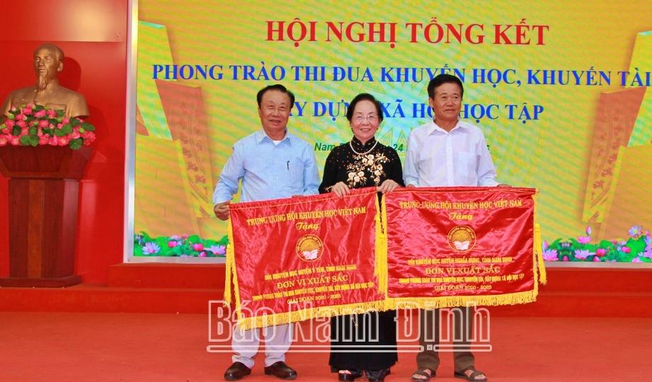 GS.TS Nguyễn Thị Doan, nguyên Phó Chủ tịch nước, Chủ tịch Hội Khuyến học Việt Nam trao Cờ đơn vị xuất sắc trong phong trào thi đua khuyến học, khuyến tài, xây dựng xã hội học tập giai đoạn 2020-2025 của Trung ương Hội cho các tập thể. Ảnh: Báo Nam Định