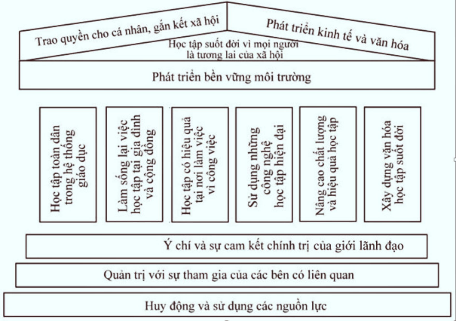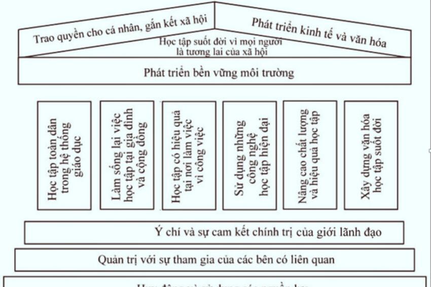 Cấu trúc xã hội học tập giai đoạn 2026-2030 vẫn nên theo 3 yêu cầu về xã hội học tập mà UNESCO thể hiện qua logo "tòa nhà xã hội học tập" có 3 phần: