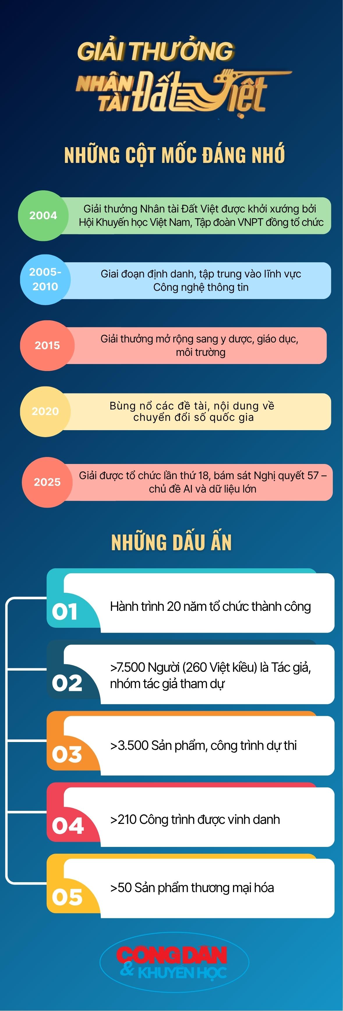 Năm 2025 đánh dấu chặng đường 20 năm của Giải Nhân tài Đất Việt, sân chơi trí tuệ quốc gia, đồng hành cùng Nghị quyết 57 về đột phá khoa học công nghệ, chuyển đổi số.