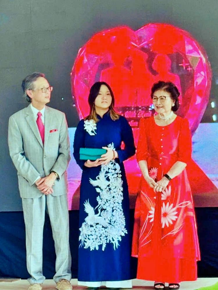 Gia đình GS. TS Khương Hữu Lộc (bên trái) cùng vợ là GS.TS Vũ Thị Hạnh Phước (bên phải) và con gái Khương Bảo Hạnh tại buổi trao học bổng.