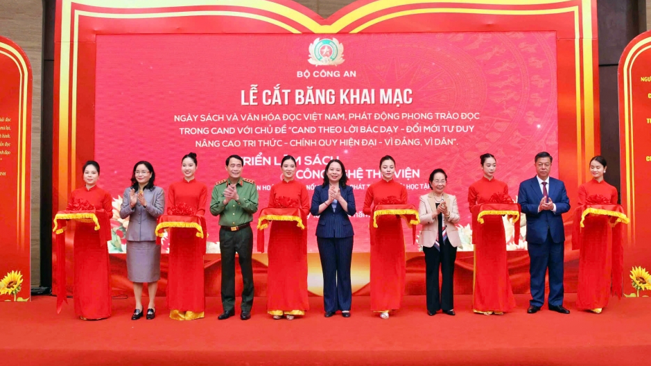 Phó Chủ tịch nước Võ Thị Ánh Xuân, nguyên Phó Chủ tịch nước Nguyễn Thị Doan, Thứ trưởng Bộ Công an Lê Quốc Hùng cùng các đại biểu cắt băng khai mạc Ngày Sách và Văn hóa đọc Việt Nam trong Công an nhân dân.