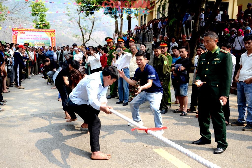 Tưng bừng màn kéo co truyền thống thi sức bền, dẻo dai trong ngày hội "Biên phòng toàn dân". Ảnh: Quốc Hồng