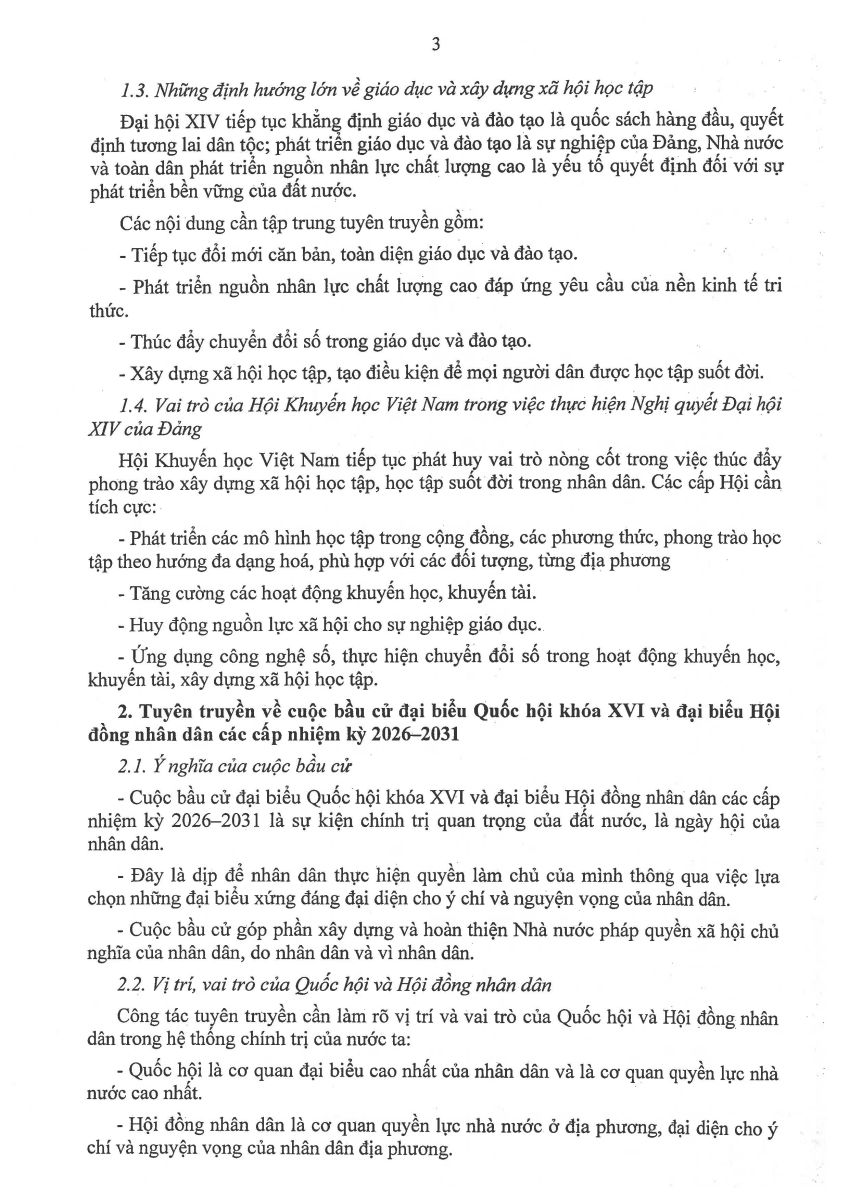 Cổng Thông tin điện tử Hội Khuyến học Việt Nam xin trân trọng đăng tài văn bản Hướng dẫn Tuyên truyền kết quả Đại hội đại biểu toàn quốc lần thứ XIV của Đảng và cuộc bầu cử đại biểu Quốc hội khóa XVI, bầu cử đại biểu Hội đồng nhân dân các cấp nhiệm kỳ 2026 - 2031: