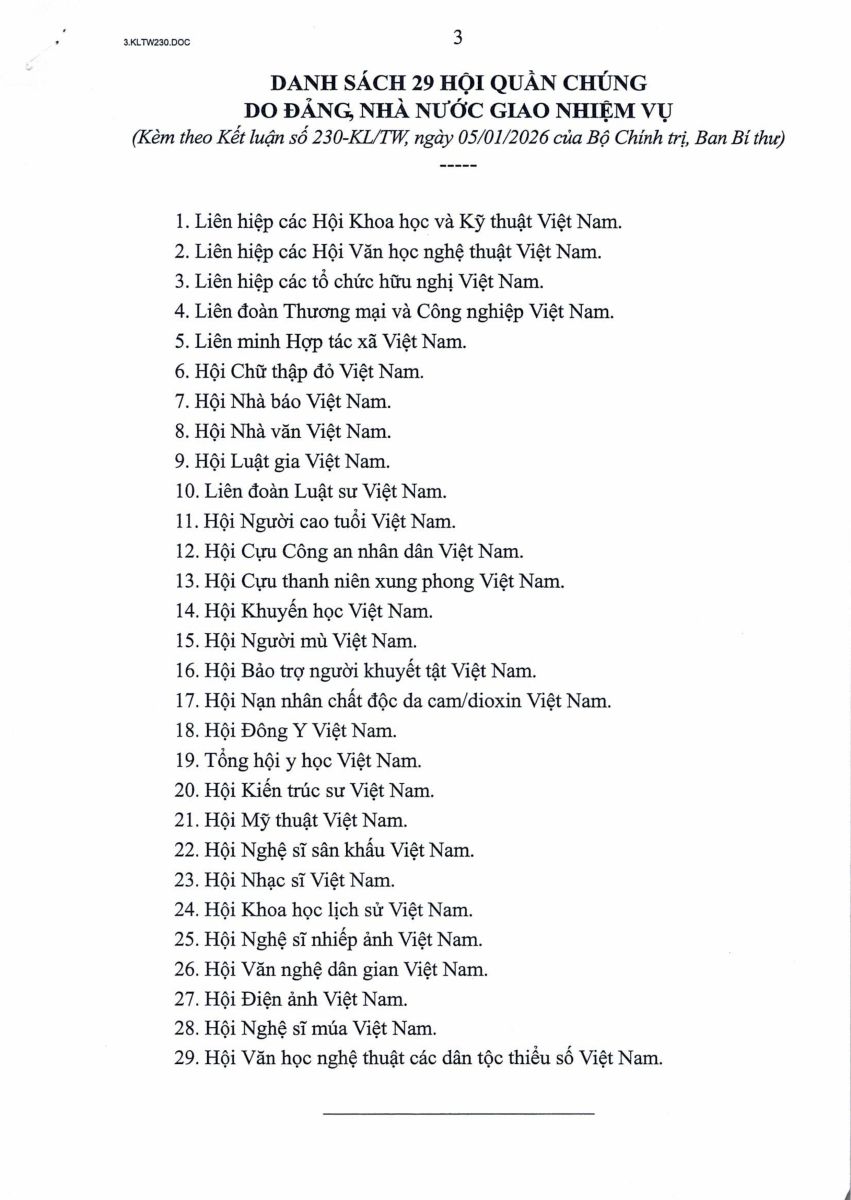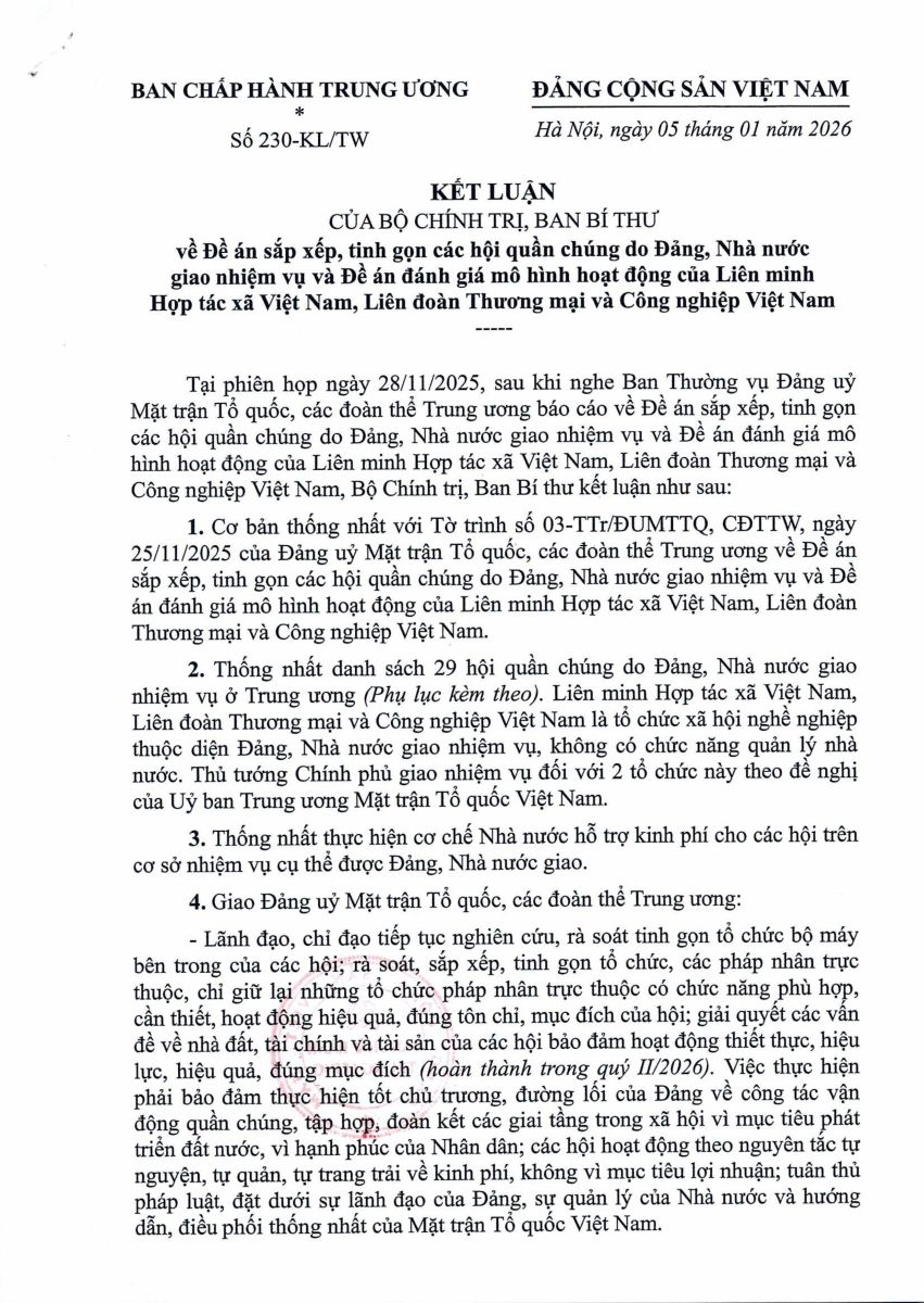 Cổng TTĐT Hội Khuyến học Việt Nam xin trân trọng giới thiệu toàn văn Kết luận số 230-KL/TW, ngày 05/1/2026 của Bộ Chính trị, Ban Bí thư về Đề án sắp xếp, tinh gọn các hội quần chúng do Đảng, Nhà nước giao nhiệm vụ và Đề án đánh giá mô hình hoạt động của Liên minh Hợp tác xã Việt Nam, Liên đoàn Thương mại và Công nghiệp Việt Nam: