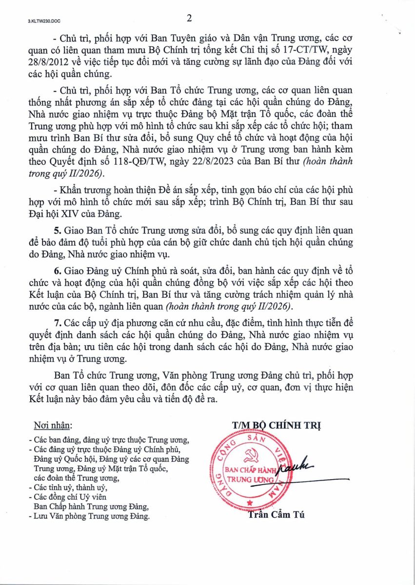 Kết luận của Bộ Chính trị, Ban Bí thư về Đề án sắp xếp, tinh gọn các hội quần chúng do Đảng, Nhà nước giao nhiệm vụ