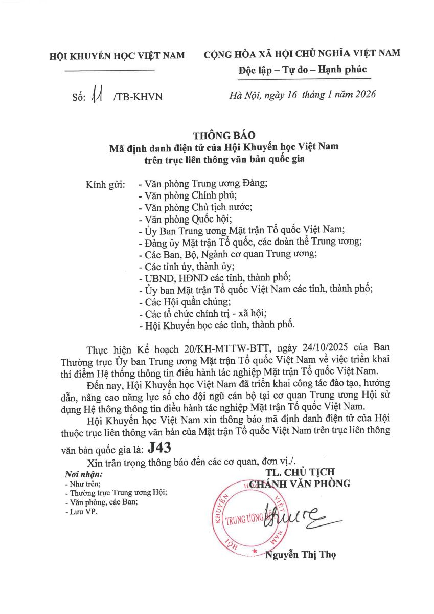 | 1 | Thông báo Mã định danh điện tử của Hội Khuyến học Việt Nam trên trục liên thông văn bản quốc gia |