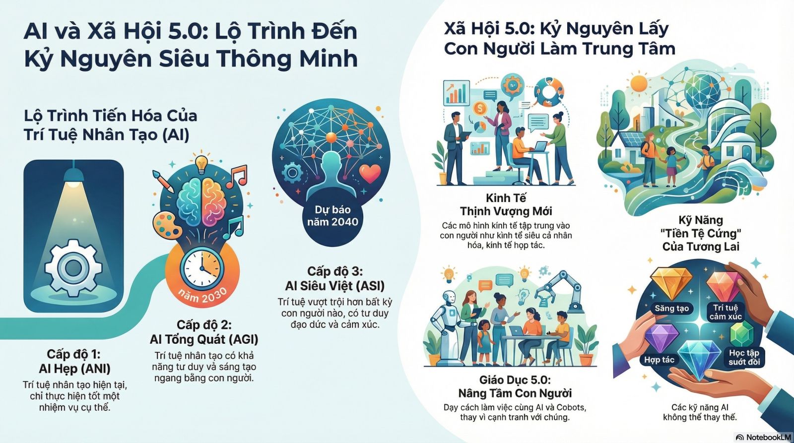 Ngay buổi bình minh kết nối các công nghệ số trong mọi lĩnh vực hoạt động, chương trình chuyển đổi số quốc gia đã dấy lên tinh thần toàn dân tiến bước vào kỷ nguyên số. Tuy không có sự lạc quan như Elon Musk, nhưng tôi hi vọng đến năm 2030, Narrow AI sẽ trở thành AGI, và tới năm 2040, trên thế giới sẽ xuất hiện ASI. Tại thời điểm đó, nhân loại sẽ đặt bàn chân của mình tới vạch giới hạn phân cách xã hội tri thức với xã hội thông minh.